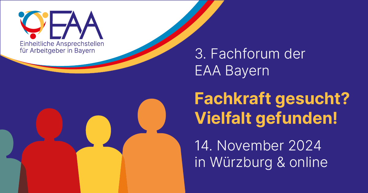 Das 3. Fachforum der Einheitlichen Ansprechstellen für Arbeitgeber (EAA) Bayern erkundet unter dem Titel „Fachkraft gesucht? Vielfalt gefunden!“ Antworten darauf. Am 14. November 2024 wartet von 14:00 bis 18:00 Uhr ein abwechslungsreiches Programm auf die Gäste. Das Fachforum wird hybrid durchgeführt, Veranstaltungsort ist das Congress Centrum Würzburg.